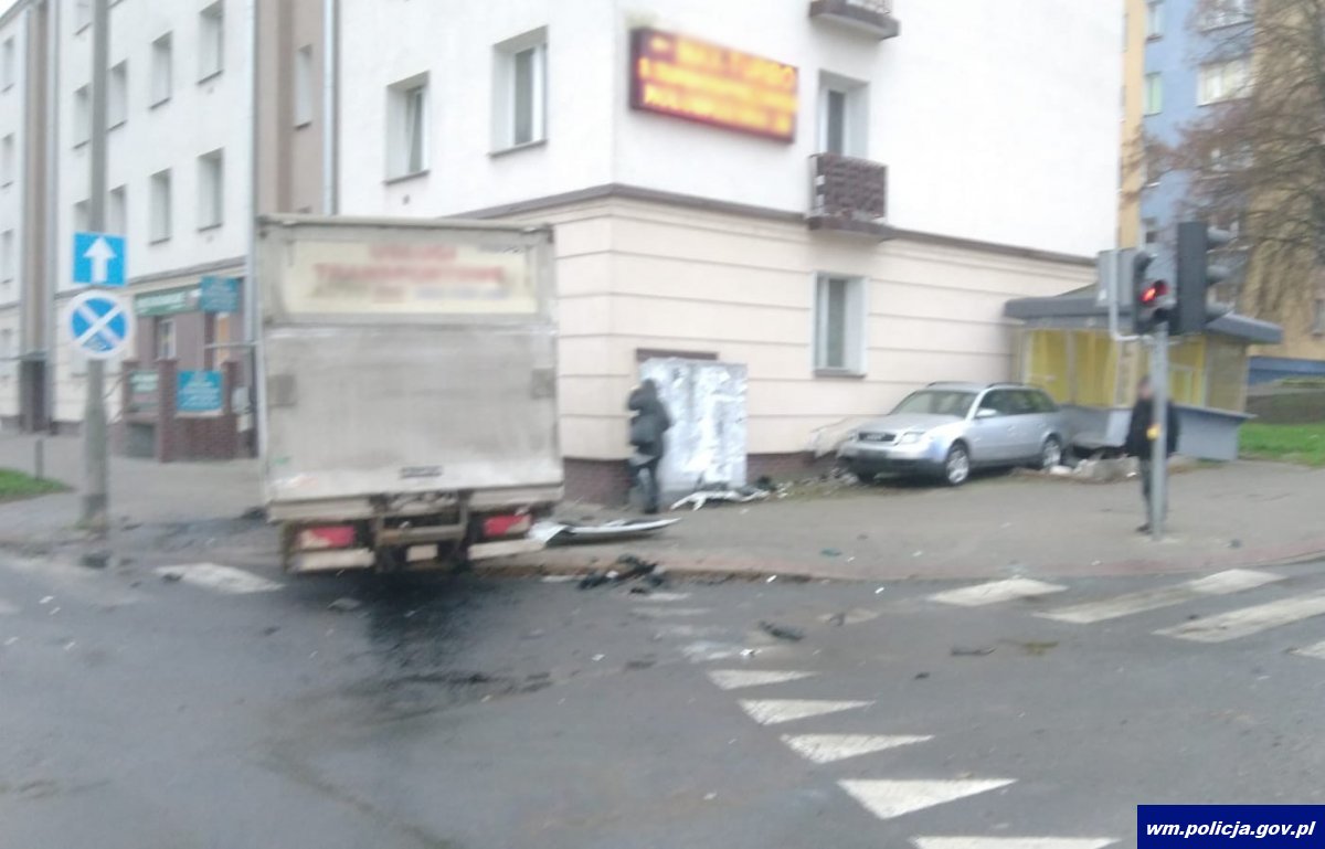 W czwartek (21.11.2019) wcześnie rano doszło do zdarzenia drogowego na skrzyżowaniu ulic Dworcowej i Kołobrzeskiej w Olsztynie. Ze wstępnych ustaleń policjantów pracujących na miejscu wynika, że 21-letnia kobieta kierująca osobowym audi nie ustąpiła pierwszeństwa i uderzyła w dostawczego mercedesa, za którego kierownicą siedział 54-letni mężczyzna. W wyniku zdarzenia został uszkodzone oba pojazdy, elewacja pobliskiego budynku, stojący obok kiosk oraz sygnalizator świetlny. Badanie stanu trzeźwości wykazało, że kierowcy w momencie zdarzenia byli trzeźwi. Kierująca audi i jeden z pasażerów z obrażeniami trafili do szpitala.