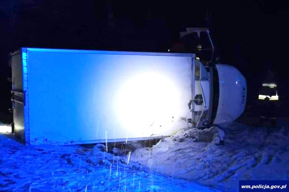 W nocy z poniedziałku na wtorek, przed godz. 4:00 na drodze krajowej nr 63, kilka kilometrów za Piszem w stronę miejscowości Jeże, samochód dostawczy przewożący mięso wpadł do przydrożnego rowu. Policjanci pracujący na miejscu zdarzenia ustalili, że kierujący tym samochodem nie dostosował prędkości do warunków panujących na drodze i w pewnym momencie wjechał w oblodzoną koleinę. Ostatecznie stracił panowanie nad pojazdem i zjechał do przydrożnego rowu. Pojazdem tym kierował 46-letni mieszkaniec powiatu mrągowskiego. Mężczyzna nie doznał obrażeń.