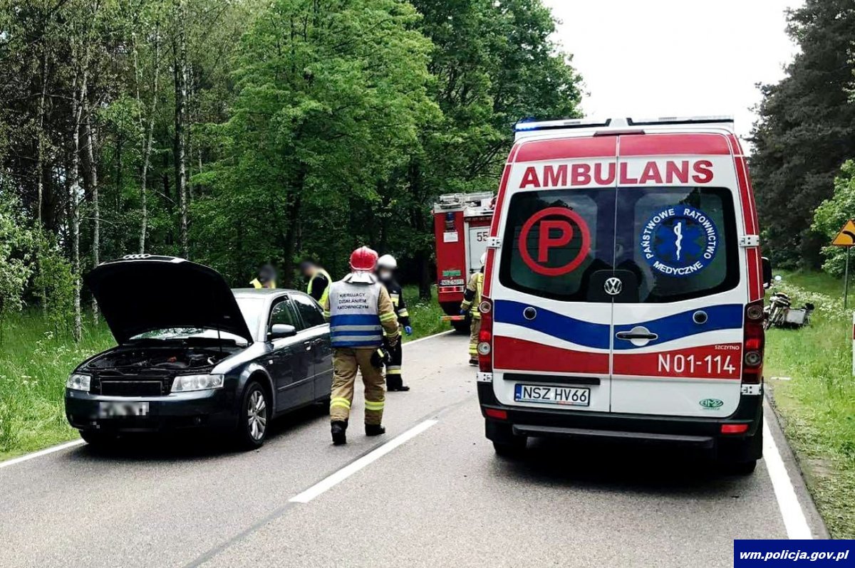 Szczycieńscy policjanci, strażacy oraz załoga karetki pogotowia pracowali na miejscu zdarzenia drogowego, do którego doszło w sobotę około godz. 12:30, na DK-57 na trasie Piwnice Wielkie - Wielbark. Z ustaleń funkcjonariuszy pracujących na miejscu wynika, że 51-letni motocyklista, nie zachował bezpiecznej odległości od poprzedzającego go pojazdu marki Audi. Gdy 23-latek, kierowca Audi, na widok pieszego poruszającego się jezdnią gwałtownie zahamował, w tył jego pojazdu wjechał motocykl. 51-latek został przetransportowany przez załogę karetki pogotowia do szpitala w Biskupcu. Wszyscy uczestnicy zdarzenia to mieszkańcy województwa mazowieckiego, w chwili zdarzenia byli trzeźwi.
