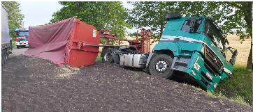 Wczoraj (27.07.2020) około godz. 5.30 oficer dyżurny kętrzyńskich policjantów został powiadomiony, że na trasie Kętrzyn-Bartoszyce na wysokości miejscowości Kraskowo doszło do zdarzenia drogowego z udziałem dwóch pojazdów ciężarowych. Z przekazanych informacji wynikało, że auto znajduje się w przydrożnym rowie, natomiast droga jest nieprzejezdna gdyż z naczepy rozsypał się rzepak. Na miejsce natychmiast skierowani zostali policjanci i służby ratownicze. Interweniujący w tej sprawie funkcjonariusze z kętrzyńskiej komendy Policji ustalili, że kierujący pojazdem ciężarowym z naczepą wiozący rzepak chcąc ominąć stado saren zaczął gwałtownie hamować w wyniku czego pojazd został obrócony i wraz z naczepą wjechał do rowu. Przewożony na przyczepie rzepak rozsypał się na jezdnię. Drugi z pojazdów jadący za „tirem”, również ciężarowy, chcąc ominąć przeszkodę zjechał na pobocze gdzie został unieruchomiony. Droga ta tym odcinku była całkowicie zablokowana. Policjanci wyznaczyli objazdy. Na szczęście pomimo groźnie wyglądającego zdarzenia kierujący nie doznali obrażeń.