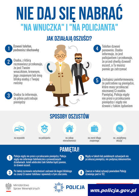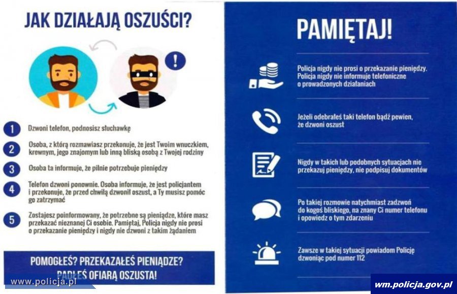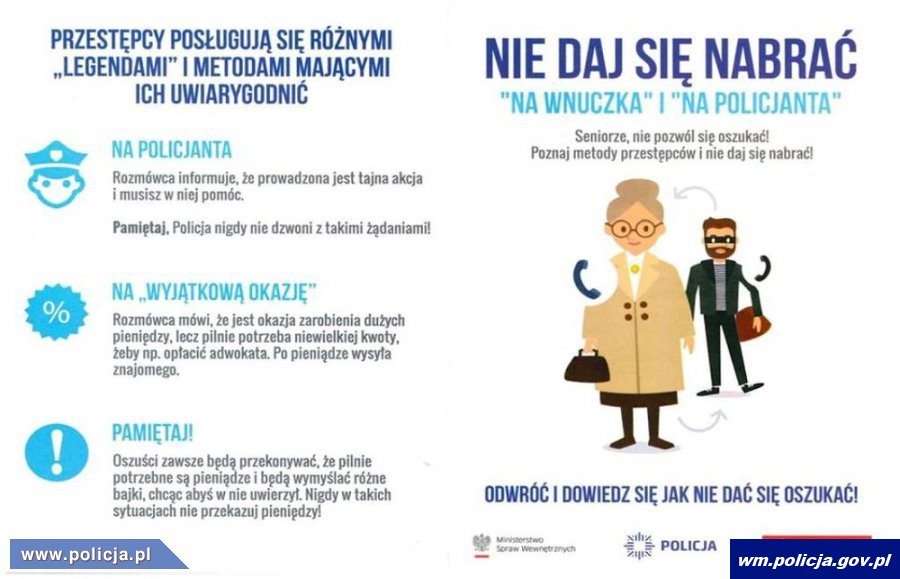 Oszuści podający się za funkcjonariuszy CBŚP dzwonią do osób starszych próbując namówić je na udział w policyjnych działaniach. Warunek jest taki, że trzeba wypłacić pieniądze i przekazać je „funkcjonariuszowi”. Na ten chwyt dała się nabrać pewna 70-latka, która za namową oszusta poszła do banku, uzyskała pożyczkę, a następnie przekazała mu kopertę z pieniędzmi. Policja przypomina o zachowaniu ostrożności w kontaktach z nieznanymi osobami. Policja nigdy nie prosi o przekazanie jakichkolwiek pieniędzy czy wartościowych przedmiotów. Jeżeli taka propozycja się pojawia to jest to oszustwo.