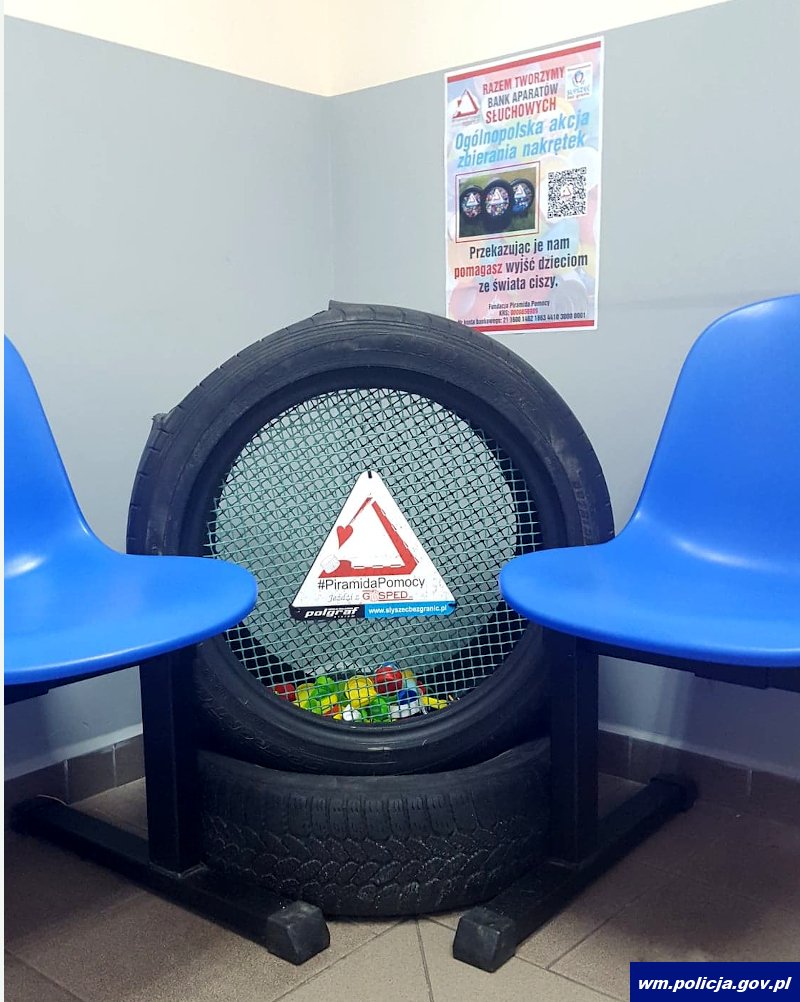 Na początku grudnia pierwszy pojemnik Fundacji Piramida Pomocy stanął w Komisariacie Policji w Lubawie. Dzięki funkcjonariuszom, pracownikom komisariatu oraz mieszkańcom Lubawy i okolic jest on systematycznie zapełniany. Dlatego mundurowi postanowili w kolejnej jednostce policji umieścić ten dość nietypowy pojemnik na nakrętki, który został wykonany ze zużytych opon. Tym razem wybór padł na Komendę Powiatową Policji w Iławie. Wszystkie zebrane nakrętki zostaną przekazane do recyclingu, a zebrane w ten sposób pieniądze otrzyma Stowarzyszeniu Słyszeć bez Granic z przeznaczeniem na zakup aparatów słuchowych w ramach banku aparatów słuchowych. Takie prezenty szczególnie cieszą, gdyż dzięki nim wspieramy osoby potrzebujące i dbamy o środowisko.