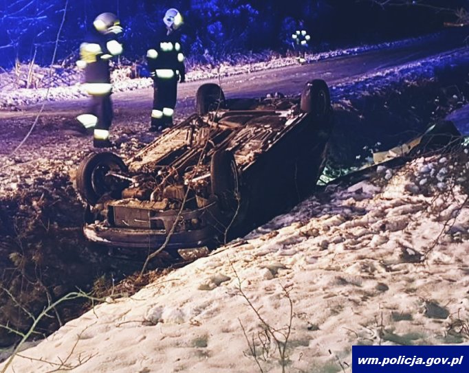 W sobotę (16.01.21r.) parę minut przed godziną 02:00 nad ranem, oficer dyżurny otrzymał telefoniczne zgłoszenie o zdarzeniu drogowym, do którego doszło tuż przed miejscowością Kucbork w gminie Wielbark. Osoba zgłaszająca oświadczyła, że auto osobowe musiało wypaść z drogi i dachować. Obecnie pojazd znajduje się w przydrożnym rowie. Służby ratunkowe, w pojeździe marki VW Polo, zastały dwóch nieprzytomnych, zakleszczonych mężczyzn. 25-latek i jego 40-letni znajomy, obaj mieszkańcy gminy Wielbark, z obrażeniami ciała zostali przewiezieni do szpitala. Policjanci w rozmowie z lekarzem dyżurującym ustalili, że ich życiu nie zagraża niebezpieczeństwo. W toku dalszych czynności funkcjonariusze potwierdzili, że obaj mężczyźni w chwili zdarzenia byli nietrzeźwi. 25-latek miał promil alkoholu w organizmie, a 40-latek ponad 1,5 promila. Okazało się, że sprawcą zdarzenia był 25-latek. Po przebytej hospitalizacji mężczyzna został zatrzymany i przesłuchany. Śledczy ustalili również, że był on już uprzednio skazany prawomocnym wyrokiem Sądu Rejonowego w Szczytnie za popełnienie tego rodzaju przestępstwa. Ponadto pomimo swojego młodego wieku, posiadał on już sądowy zakaz prowadzenia wszelkich pojazdów mechanicznych, który obowiązywał go przez okres 48 miesięcy. 25-latek usłyszał zarzut ponownego prowadzenia pojazdu w stanie nietrzeźwości i spowodowanie kolizji, za co grozi mu teraz nawet do 5 lat pozbawienia wolności.