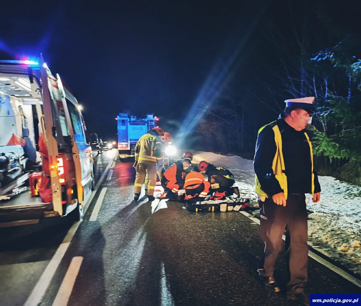 Również w poniedziałek (25.01.2021r.) około godz. 17:30 oficer dyżurny otrzymał zgłoszenie dotyczące wypadku drogowego, do którego doszło na krajowej 58. Skierowany na miejsce zdarzenia patrol ruchu drogowego ustalił, że 62-letni kierowca pojazdu ciężarowego marki Iveco jechał od miejscowości Stare Kiejkuty w kierunku miejscowości Marksewo. W tym samym kierunku poruszał się 37-letni mieszkaniec Szczytna. Niechronionych uczestnik ruchu drogowego szedł nieprawidłową stroną jezdni. Kierowca tira nie zauważył pieszego i prawdopodobnie zaczepił go lusterkiem. W wyniku tego zdarzenia 37-latek doznał poważnych obrażeń ciała. Został on przetransportowany przez załogę karetki pogotowia do szpitala w Olsztynie. Jak ustalili funkcjonariusze, oprócz tego, że 37-latek poruszał się nieprawidłową stroną jezdni to nie posiadał również wymaganych przepisami elementów odblaskowych i był nietrzeźwy. 62-latek, mieszkaniec Nidzicy, był trzeźwy Uprawienia do kierowania posiadał od 39 lat. Krajowa 58 przez dłuższy czas była zablokowana. Na miejscu wypadku pracowali strażacy, policjanci i ratownicy medyczni. Obecnie śledczy wyjaśnią dokładne przyczyny i okoliczności tego zdarzenia.