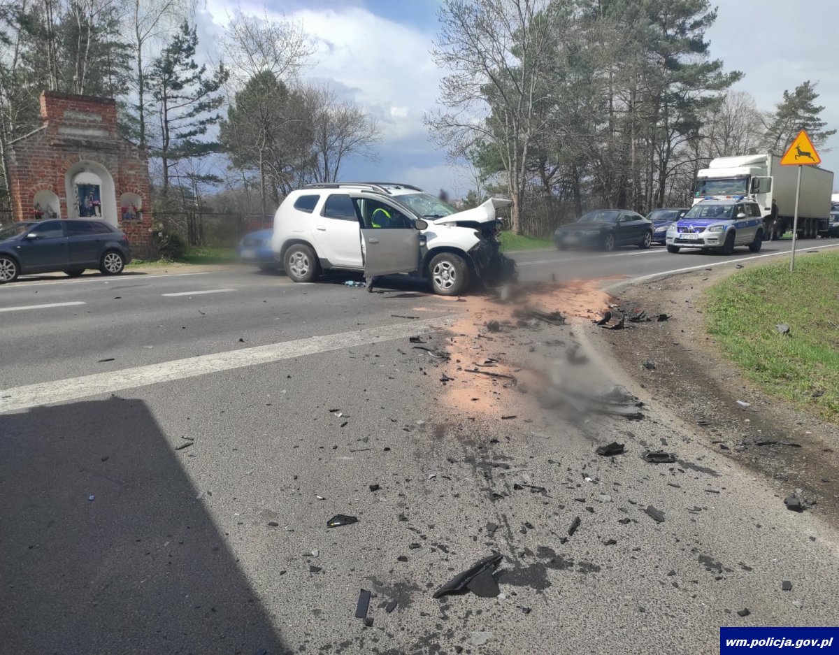 W czwartek (22.04.2021) oficer dyżurny Komisariatu Policji w Dobrym Mieści otrzymał zgłoszenie o wypadku drogowym na DK 51. Ze wstępnych ustaleń policjantów pracujących na miejscu wynika, że 27-letni kierujący osobową dacią w rejonie skrzyżowania z m. Podleśna rozpoczął manewr omijania innego pojazdu, który zatrzymał się na jedni i oczekiwał na możliwość wykonania skrętu w lewo. Na skutek takiego manewru kierowca daci zjechała na przeciwległy pas ruchu i doprowadził do czołowego zderzenia z jadącym z naprzeciwka seatem, a następnie uderzył w audi. W wyniku zdarzenia osobowy seat stoczył się w kierunku drogi podporządkowanej i uderzył w inne auto. W wyniku zdarzenia 4 osoby trafiły do szpitala z obrażenia skutkującymi rozstrój zdrowia powyżej 7 dni. Wśród uczestników zdarzenia było niemowlę i kilkuletnie dziecko, którym na szczęście nic poważnego się nie stało. Droga w tym miejscu była zablokowana przez ponad godzinę, policjanci zorganizowali objazdy. Funkcjonariusze teraz wyjaśniają wszelkie okoliczności wypadku drogowego.