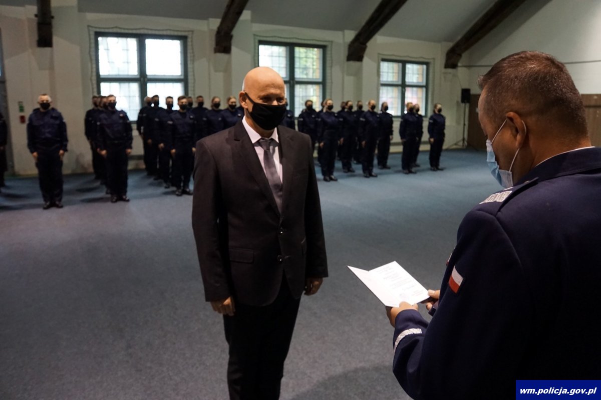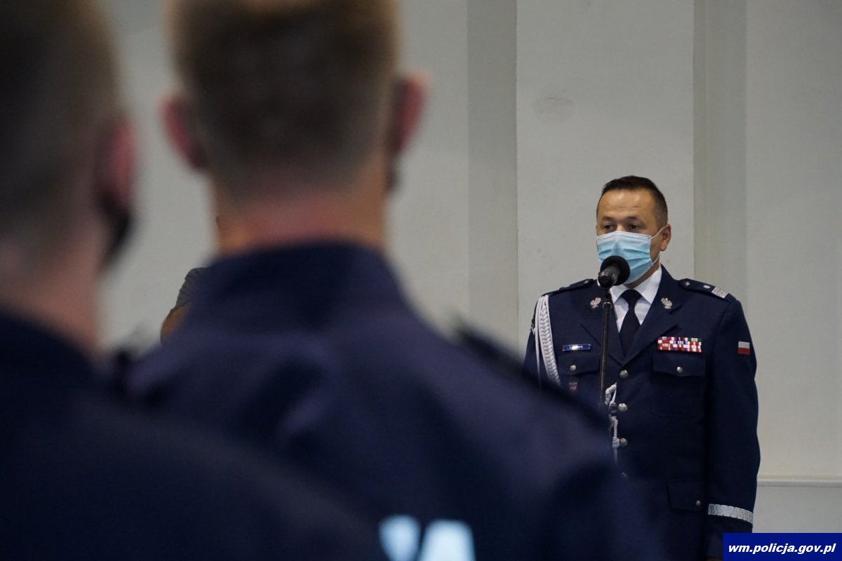 Niestety względy sanitarne nie pozwoliły na to, aby ślubowanie mogło się odbyć z udziałem grona bliskich nowych funkcjonariuszy. Policjantom wypowiadającym słowa roty ślubowania, przyglądał się i przysłuchiwał ich szef nadinsp. Tomasz Klimek Komendant Wojewódzki Policji w Olsztynie.