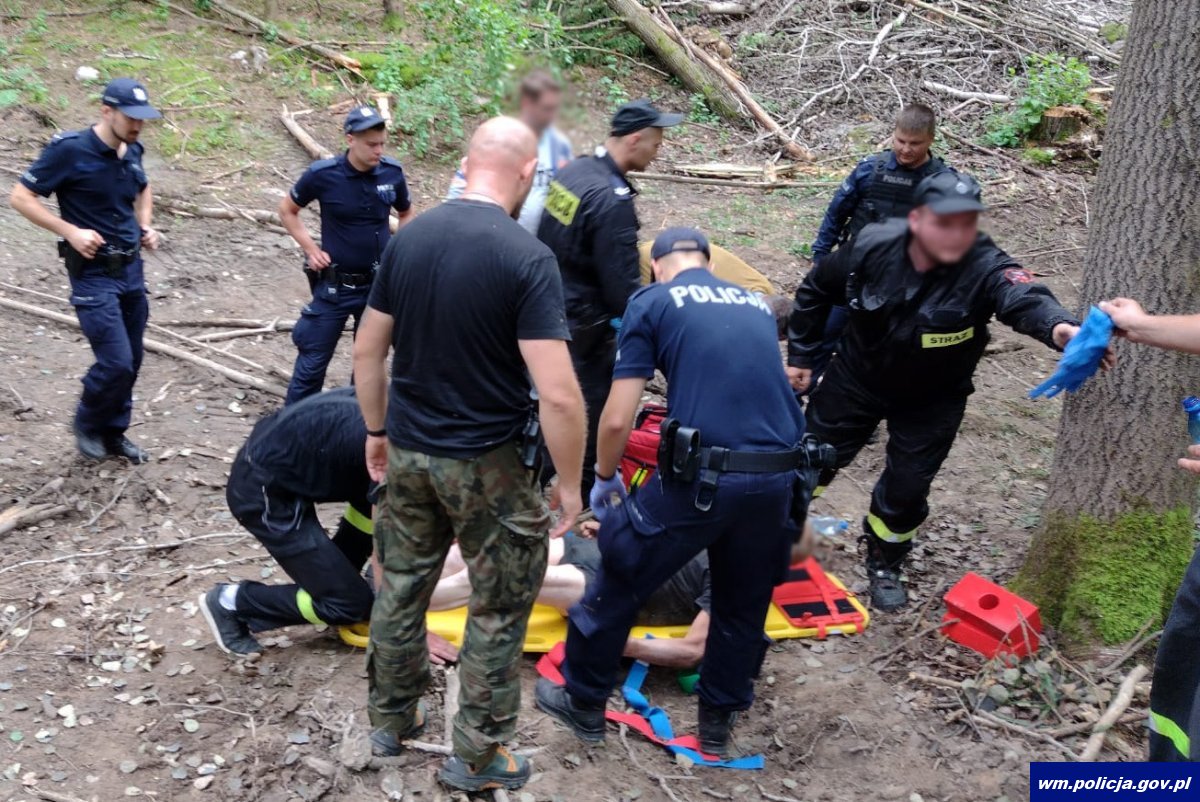 Po kilku godzinach przeszukiwania lasu, policjanci z OPP w Olsztynie w wąwozie odnaleźli żywego, ale bardzo wycieńczonego mężczyznę. 73-latek leżał na ziemi i nie był w stanie o własnych siłach wydostać się z lasu. Miał problem ze skonstruowaniem logicznej wypowiedzi, nie miał świadomości gdzie się znajduje i dlaczego. Czterej policjanci OPP udzielili mu pierwszej pomocy przedmedycznej, uspokoili, zadbali o jego komfort i powiadomili służby medyczne. Teren ten był trudny i niedostępny dla karetki pogotowia, dlatego przy pomocy pozostałych uczestników akcji poszukiwawczej mężczyznę na noszach przetransportowano do najbliższych zabudowań. A tam już przekazano pod opiekę medykom. W opinii lekarza odwodniony 73-latek znajdował się w stanie zagrażającym jego życiu, dlatego został przewieziony do szpitala.