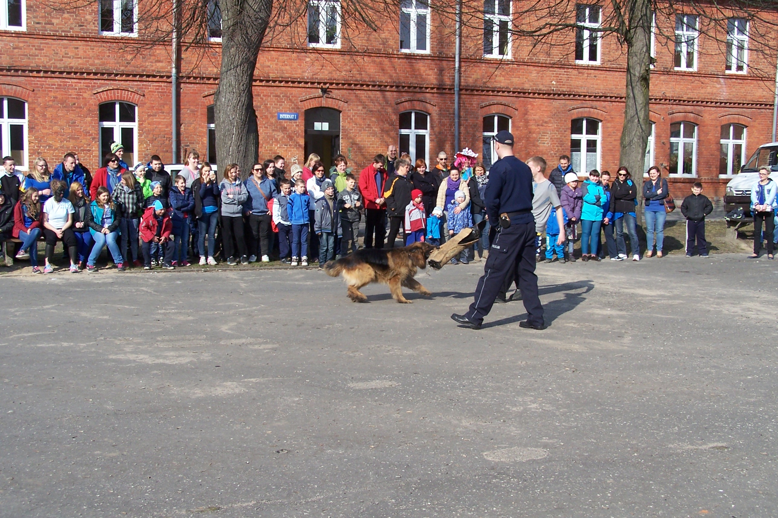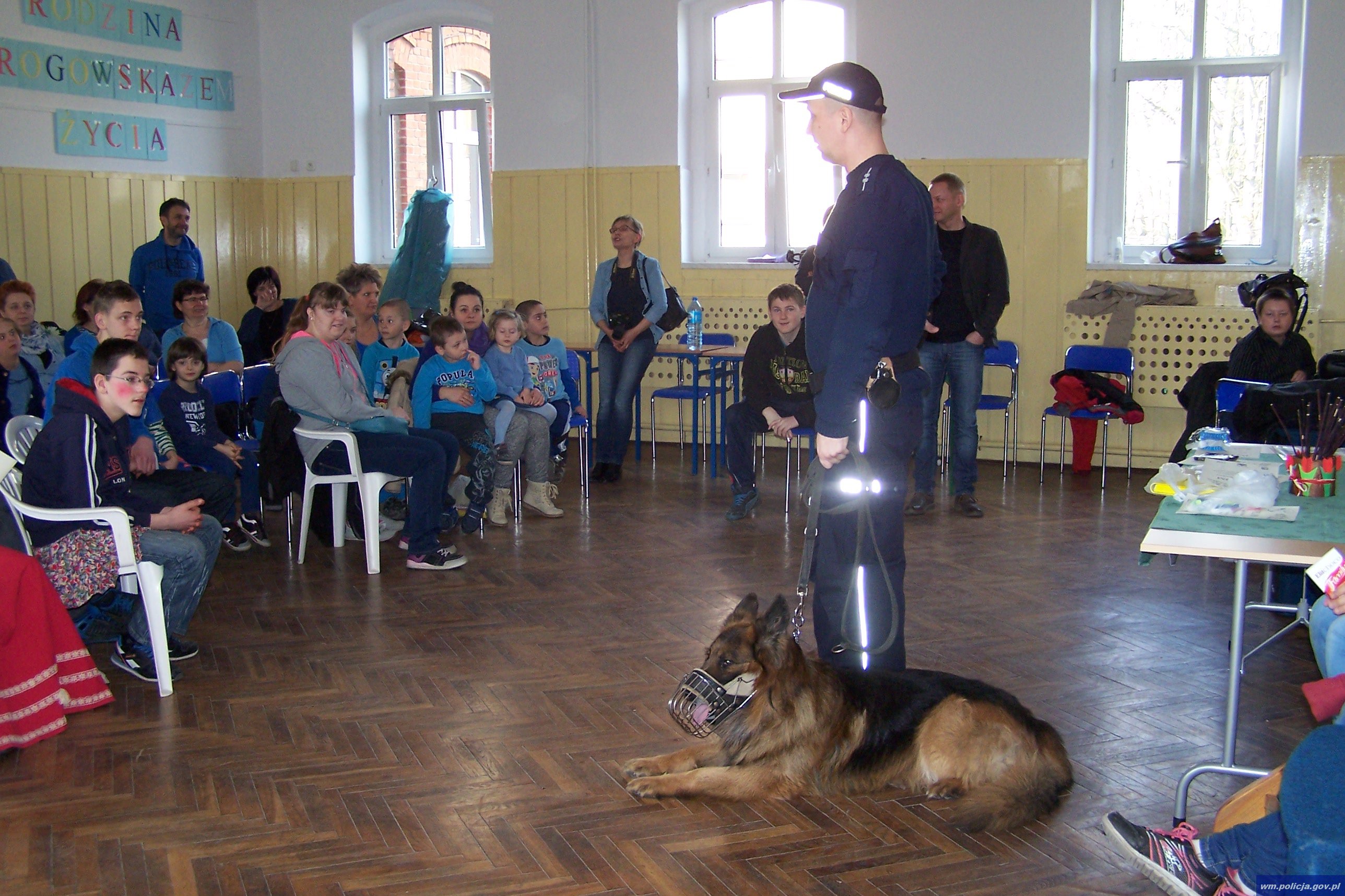 Asp. Łukasz Andrzejewski na co dzień pracujący ze swoim czworonożnym partnerem Reksem na początku opowiedział o charakterze pracy przewodnika psa. Następnie przekazał dzieciom wiedzę na temat prawidłowych zachowań w kontakcie z agresywnymi zwierzętami oraz pokazał bezpieczną postawę „żółwia” aby uniknąć pogryzienia. Uczniowie chętnie wysłuchali prelekcji przewodnika, a na zakończenie mogli zobaczyć elementy tresury psa oraz przyjrzeć się jak Reks wykonuje wydawane polecenia.