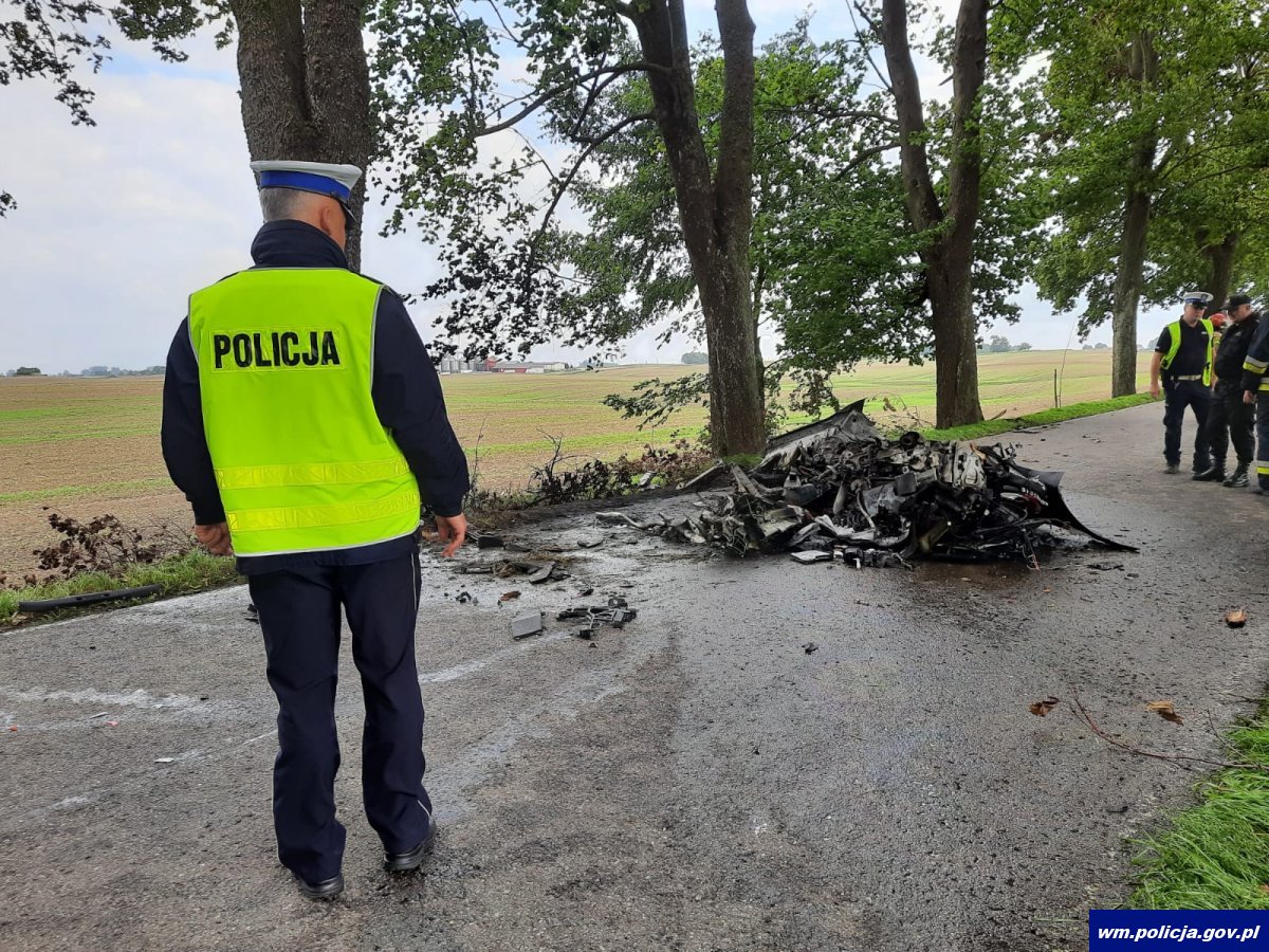 Do zdarzenia doszło w piątkowe popołudnie (03.09.2021r.) około godziny 13.30 na trasie Mikołajki – Szymonka w gminie Mikołajki. Kierujący samochodem osobowym 47 – letni mieszkaniec Warszawy na prostym odcinku drogi stracił panowanie nad pojazdem, zjechał na pobocze i uderzył w przydrożne drzewa. Następnie auto stanęło w płomieniach. 47 – letni kierowca oraz podróżujący z nim 22 – letni mieszkaniec Giżycka zginęli na miejscu. Policjanci wyjaśniają okoliczności tego wypadku.