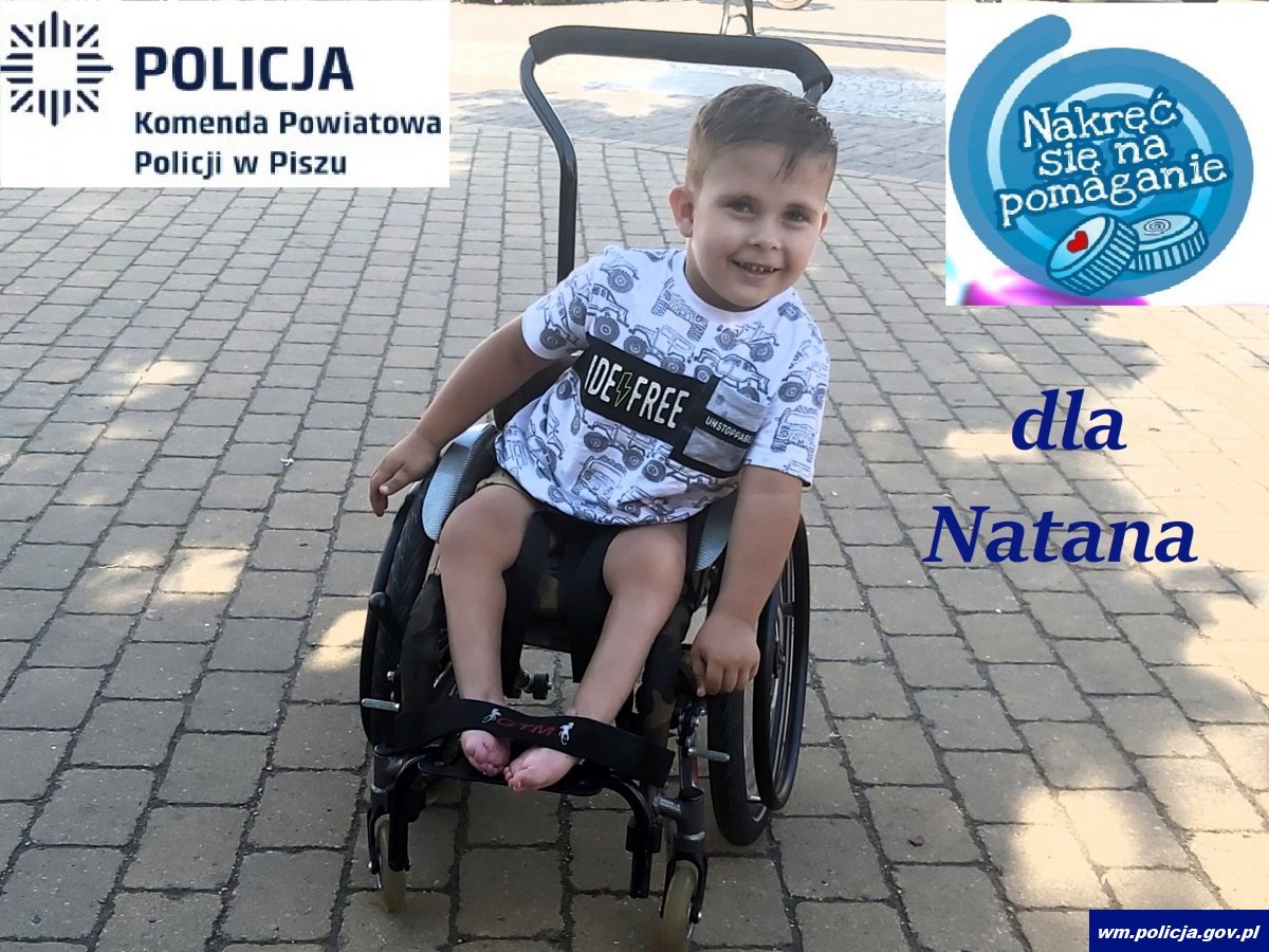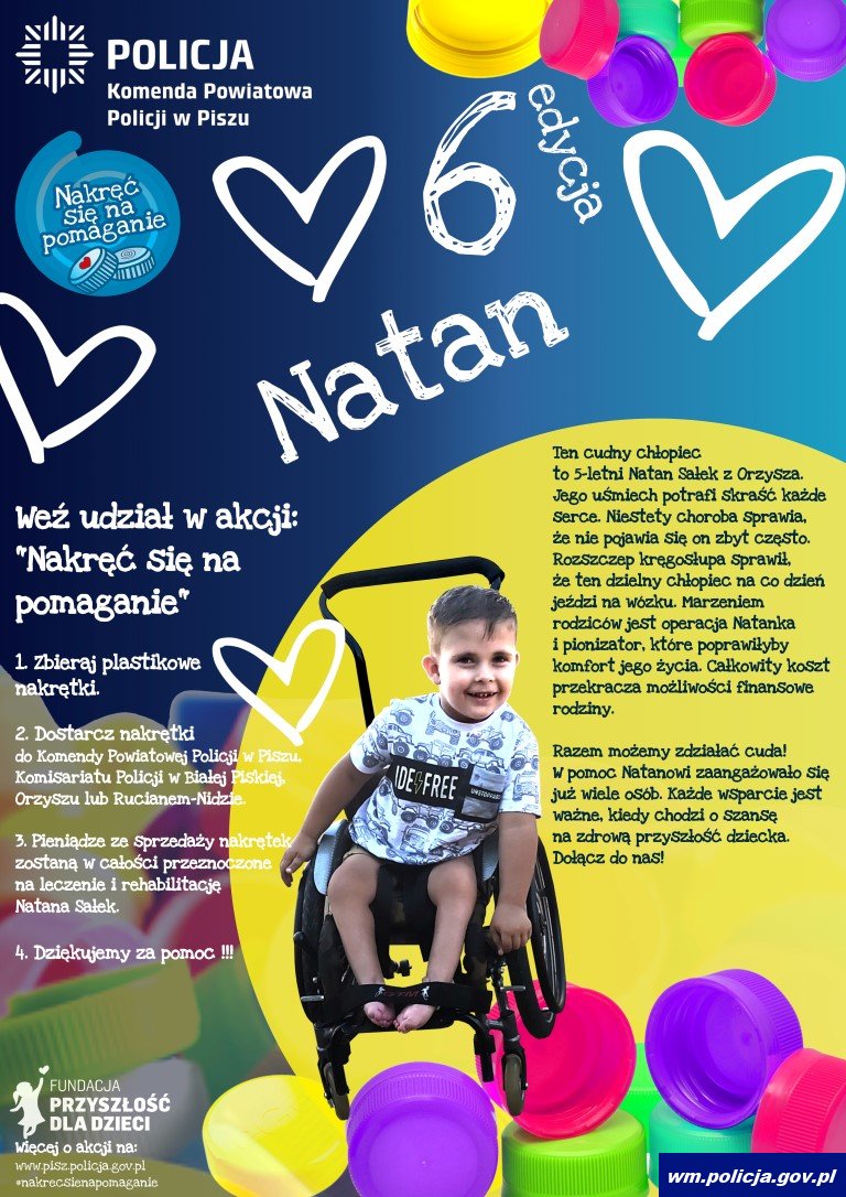 Dzielnicowy z Białej Piskiej, asp. Adam Trzonkowski zaprasza wszystkich do udziału w kolejnej zbiórce nakrętek pod hasłem „Nakręć się na pomaganie”. W trakcie dotychczasowych pięciu akcji nazbierał łącznie 43 tony nakrętek, które pojechały ciężarówkami do punktu skupu. Tym razem dzielnicowy będzie zbierał nakrętki dla 5-letniego Natana Sałka z Orzysza. To niezwykle uśmiechnięty chłopiec, który porusza się na wózku. Ma przed sobą wiele operacji, niezwykle długą i żmudną rehabilitację wymagającą profesjonalnego sprzętu. Wierzymy, że dzięki pomocy innych, stanie na nogi i zagra w wymarzoną piłkę.