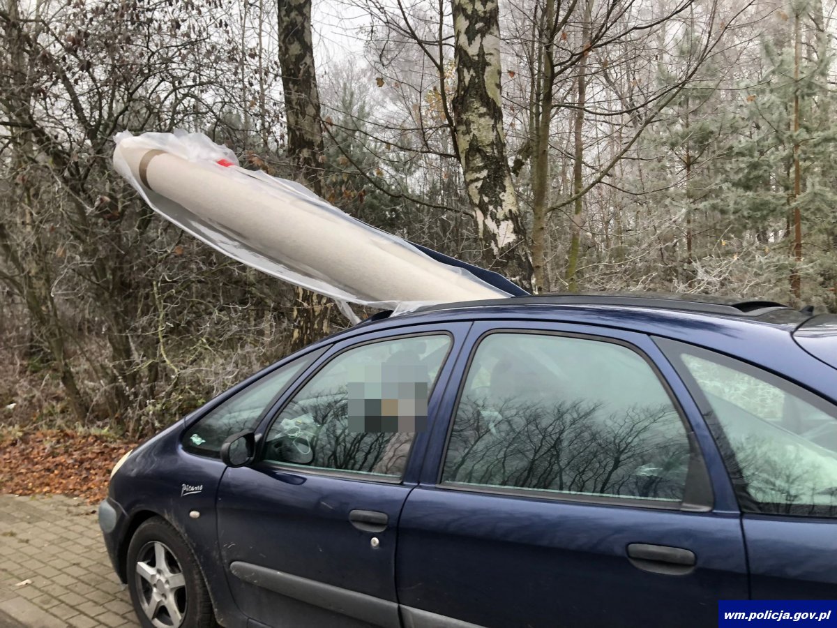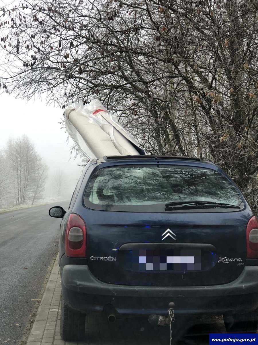 We wtorek (09.11.2021r.) około godziny 11:00 policjanci ruchu drogowego pracujący na terenie Gminy Rozogi zatrzymali do kontroli drogowej pojazd osobowy marki Citroen, którego nie sposób było nie zauważyć. Powodem kontroli był wystający ładunek, który był przewożony przez kierującego, a który aż za nad to wystawał poza obrys samochodu.