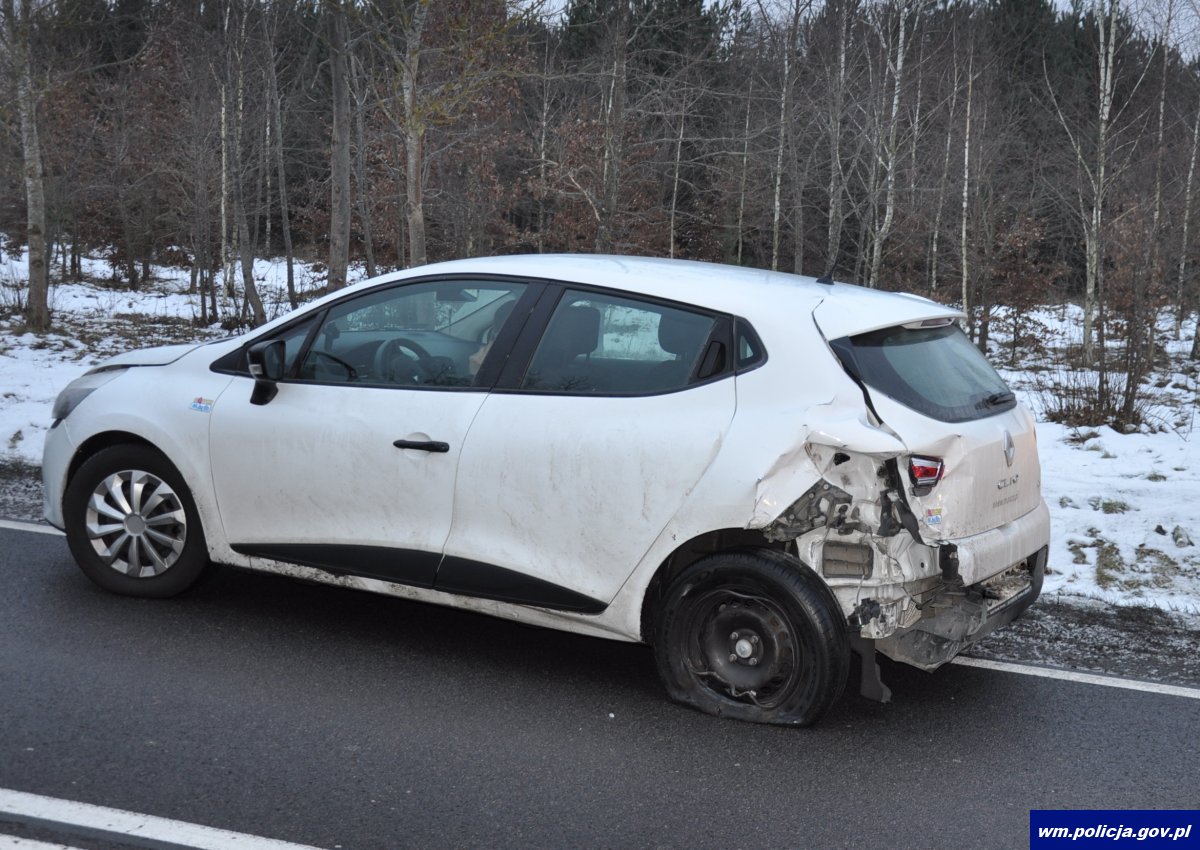 W zdarzeniu drogowym uczestniczył także samochód marki Renault, którym kierowała 38-letnia mieszkanka Łomży. Kobieta była trzeźwa. Powiedziała, że jechała od strony Pisza w kierunku Kolna. W pewnym momencie z prawej strony na drogę wyjechał samochód marki Kia, który jechał przed nią. Sposób jazdy tego kierowcy wskazywał na to, że jest nietrzeźwy. Kierująca renault wyprzedziła go chcąc zajechać mu drogę i uniemożliwić dalszą jazdę. Kierowca kia postanowił jednak ją wyprzedzić i zrobił to tuż przed łukiem drogi. Chcąc uniknąć czołowego zderzenia z samochodami jadącymi z przeciwka nagle zjechał na prawy pas drogi doprowadzając do zderzenia z wyprzedzanym pojazdem marki Renault. Kobieta jadąca renault nie doznała żadnych obrażeń. Kierowca Kia uskarżał się na ból barku. Zabrany został do szpitala.