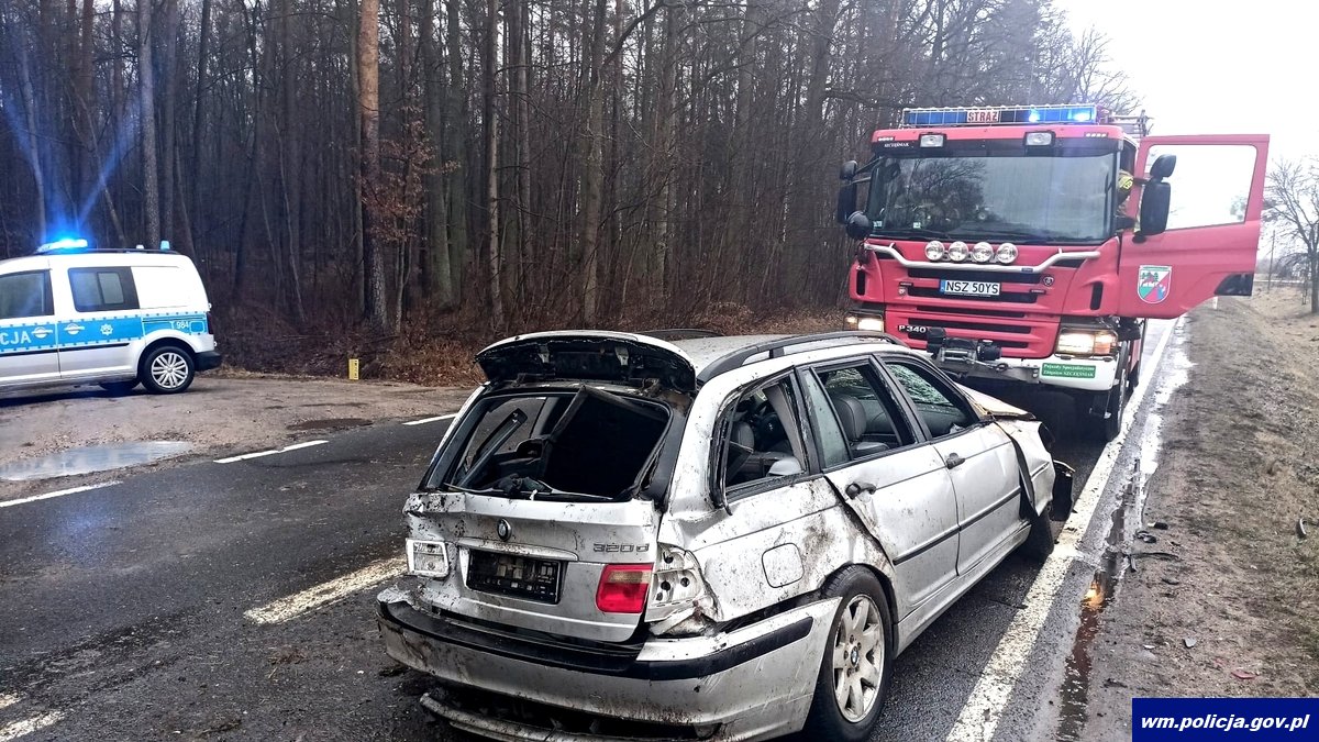 Tego samego dnia (09.02.2022r.) parę minut przed godziną 14:00 oficer dyżurny szczycieńskiej komendy przyjął zgłoszenie o zdarzeniu drogowym. Z ustaleń funkcjonariuszy wynikało, że kierowca pojazdu marki BMW jadąc od strony miejscowości Nowiny w kierunku Szczytna, na ulicy Wielbarskiej stracił panowanie nad pojazdem, zjechał do rowu i dachował. Sprawca próbował uciec