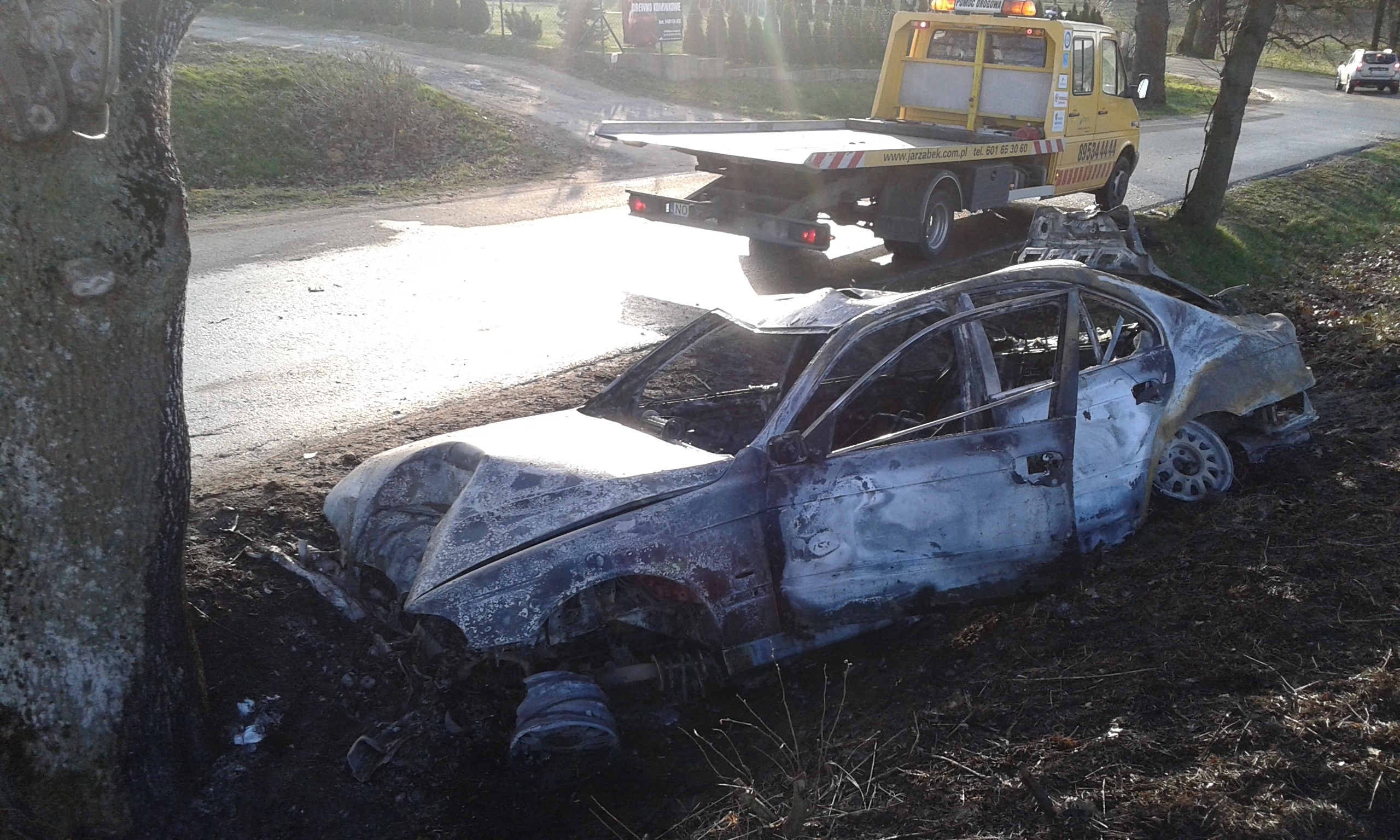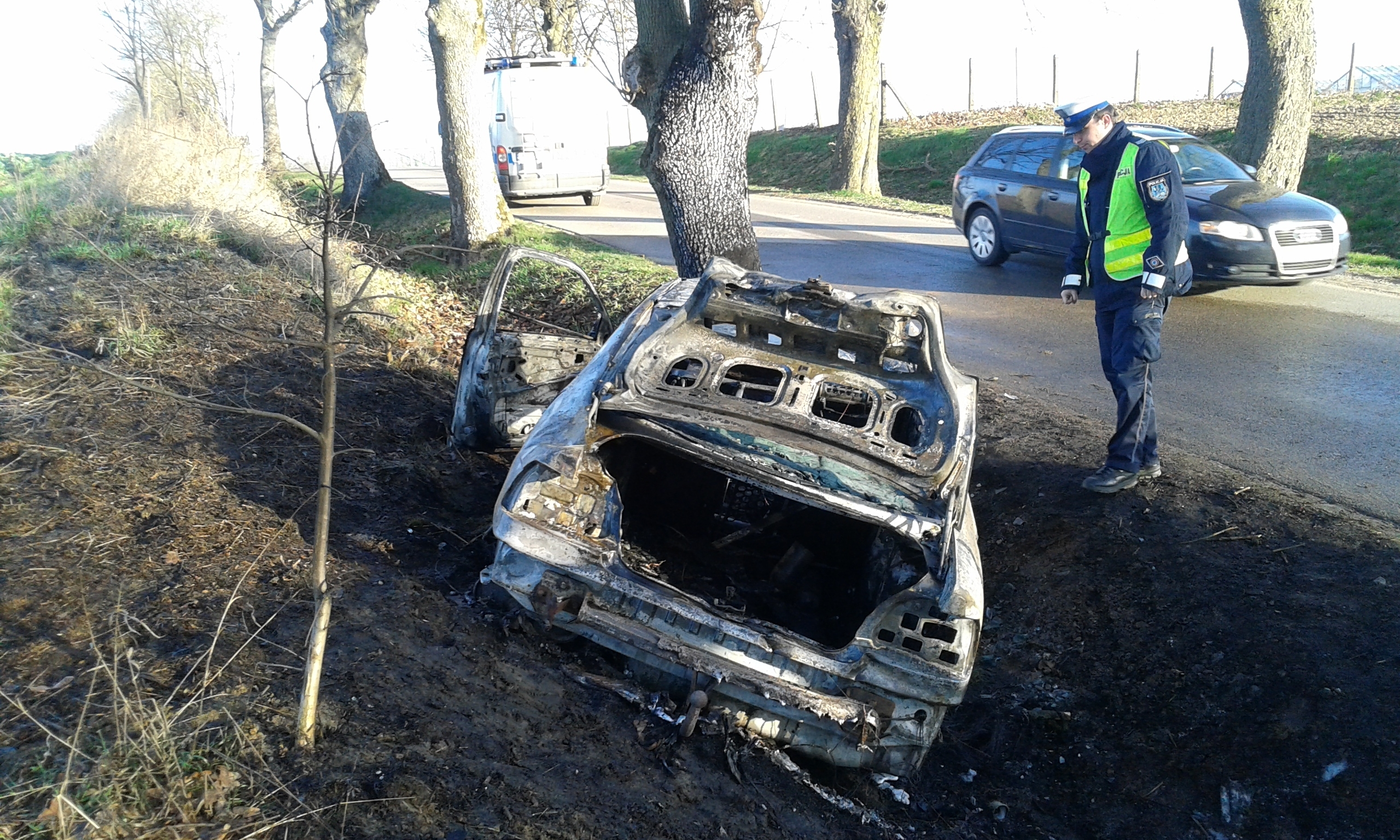 Sprawdzając otrzymane od 18-latka informacje, funkcjonariusze w miejscowości Bartążek, na drodze w kierunku Bartąga zastali płonące bmw. Jak się okazało kierowca jadąc do m. Bartąg na łuku drogi w prawo stracił panowanie nad pojazdem i uderzył w drzewo. W wyniku zdarzenia, bmw stanęło w płomieniach. Z płonącej pułapki, kierowcy na szczęście udało się wyjść o własnych siłach.