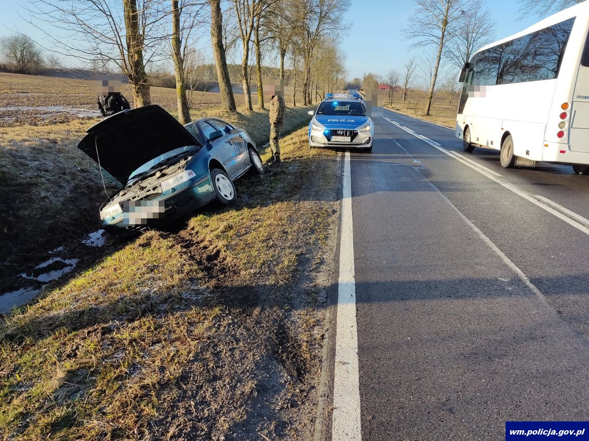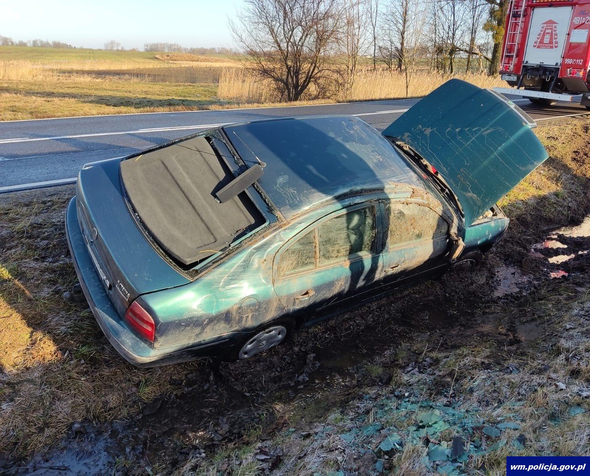 Pierwsze zdarzenie oficer dyżurny lidzbarskiej policji otrzymał o godz. 07:46. Na drodze wojewódzkiej nr 513 pomiędzy miejscowościami Orneta – Drwęczno doszło do wywrócenia się pojazdu na dach. Skierowani na miejsce policjanci ustalili przebieg zdarzenia. 80-letni kierujący pojazdem marki Renault Clio jadąc z pasażerem na oblodzonej nawierzchni wpadł w poślizg, w następstwie czego zjechał do przydrożnego rowu i dachował. Na szczęście nic nikomu się nie stało, kierujący i pasażer auta opuścili pojazd sami. Ruch w miejscu zdarzenia był wahadłowy. Kierujący był trzeźwy. W pojeździe renault zatrzymano dowód rejestracyjny. Kierujący pojazd zabezpieczył we własnym zakresie.