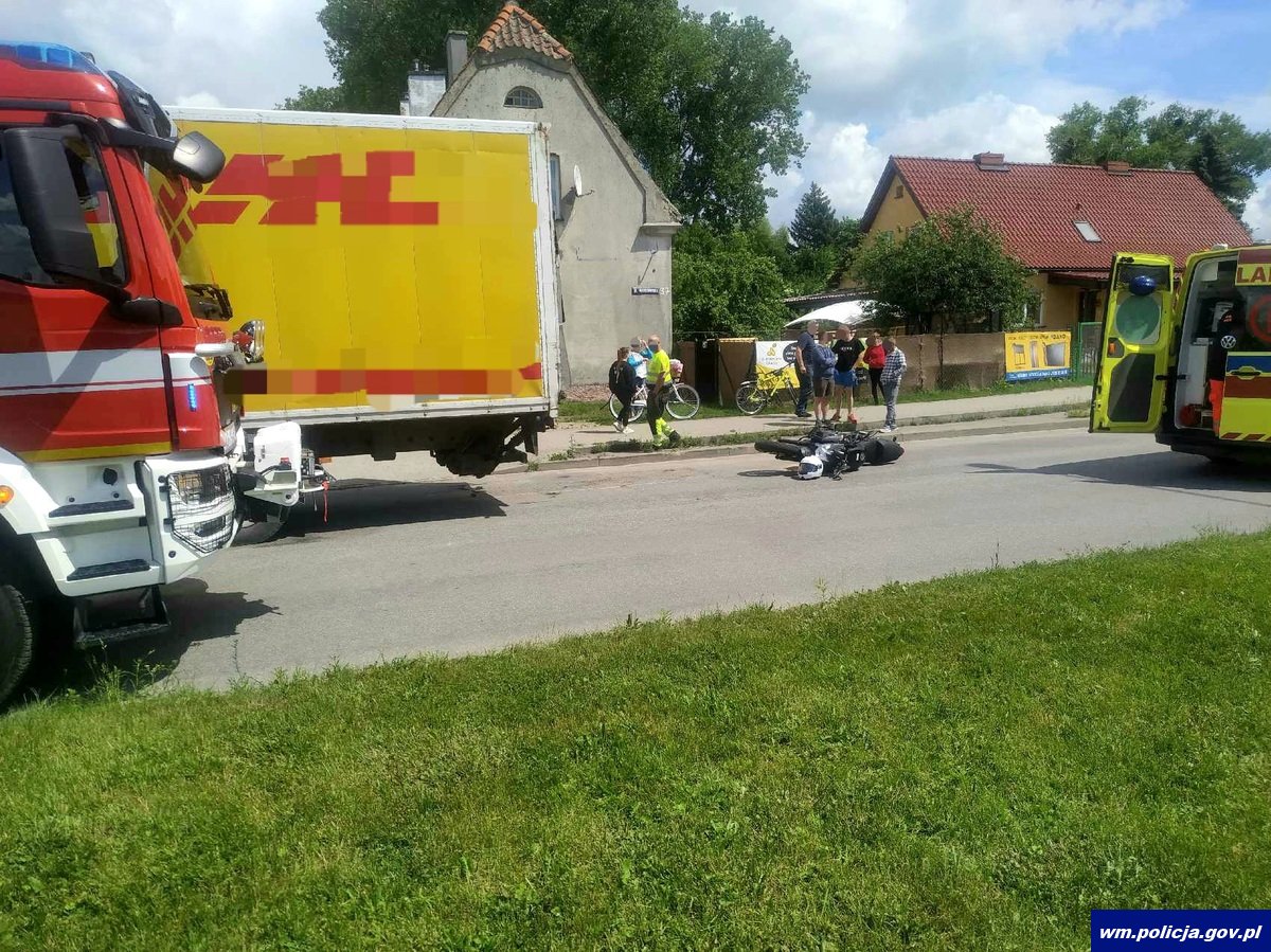 22-latek kierujący ciężarowym mercedesem podczas cofania najechał na stojącego za nim 48-letniego motocyklistę. Kierujący jednośladem na skutek doznanych obrażeń został przetransportowany do szpitala. Obaj uczestnicy wypadku to mieszkańcy Olsztyna, byli trzeźwi.