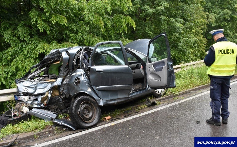 Policjanci pracowali na miejscu wypadku drogowego, do którego doszło na trasie Pisz- Ruciane Nida. Na łuku drogi kierujący pojazdem marki Citroen zjechał na przeciwległy pas ruchu i uderzył w jadący z przeciwka samochód ciężarowy marki Scania. Kierowca osobówki w ciężkim stanie zabrany został do szpitala. Droga krajowa w tym miejscu zablokowana była przez kilka godzin.