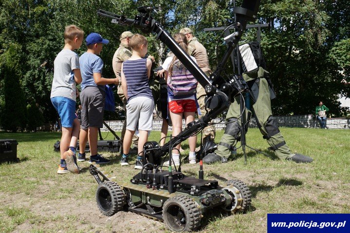 Dzieci sprawdzajace sprzęt policjantów z Samodzielnego Pododdziału Kontrterrorystycznego Policji -