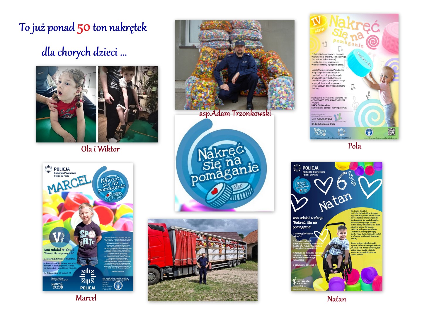 Pierwsza zbiórka nakrętek, by wspomóc finansowo leczenie dzieci, zorganizowana została przez dzielnicowego z Białej Piskiej asp. Adama Trzonkowksiego w 2017 roku. Wówczas policjant postanowił zebrać środki na leczenie i rehabilitację rodzeństwa z Pisza – Oli i Wiktora. W tym celu zostały przeprowadzone pierwsze dwie akcje. Kolejne były organizowane z myślą o Poli, Marcelu i Natanie. Za nami już sześć edycji akcji „Nakręć się na pomaganie”. W sumie dzielnicowemu udało się już nazbierać ponad 50 ton plastikowych korków, a to jeszcze nie koniec…