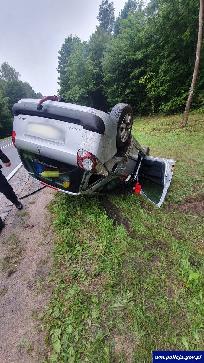W niedzielę (31.07.22) doszło do dwóch niebezpiecznie wyglądających zdarzeń osobówek. Pierwsza miała miejsce na ul. Moniuszki na trasie Giżycko – Wilkasy. 25-latka kierująca peugeotem 207 na widok skręcającego przed nią pojazdu zaczęła gwałtownie hamować wpadając w poślizg, w wyniku czego wypadła z drogi, a następnie dachowała. Z urazem szyjnym została przetransportowana do giżyckiego szpitala. Z kobietą podróżował pasażer, któremu na szczęście nic się nie stało.