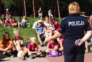 Policjantka z Wydziału Prewencji Kryminalnej i Wykroczeń Komendy Miejskiej Policji w Elblągu wspólnie z pracownikiem Wojewódzkiego Ośrodka Ruchu Drogowego w Elblągu poprowadzili spotkanie z dziećmi wypoczywającymi na półkolonii w Pogrodziu.