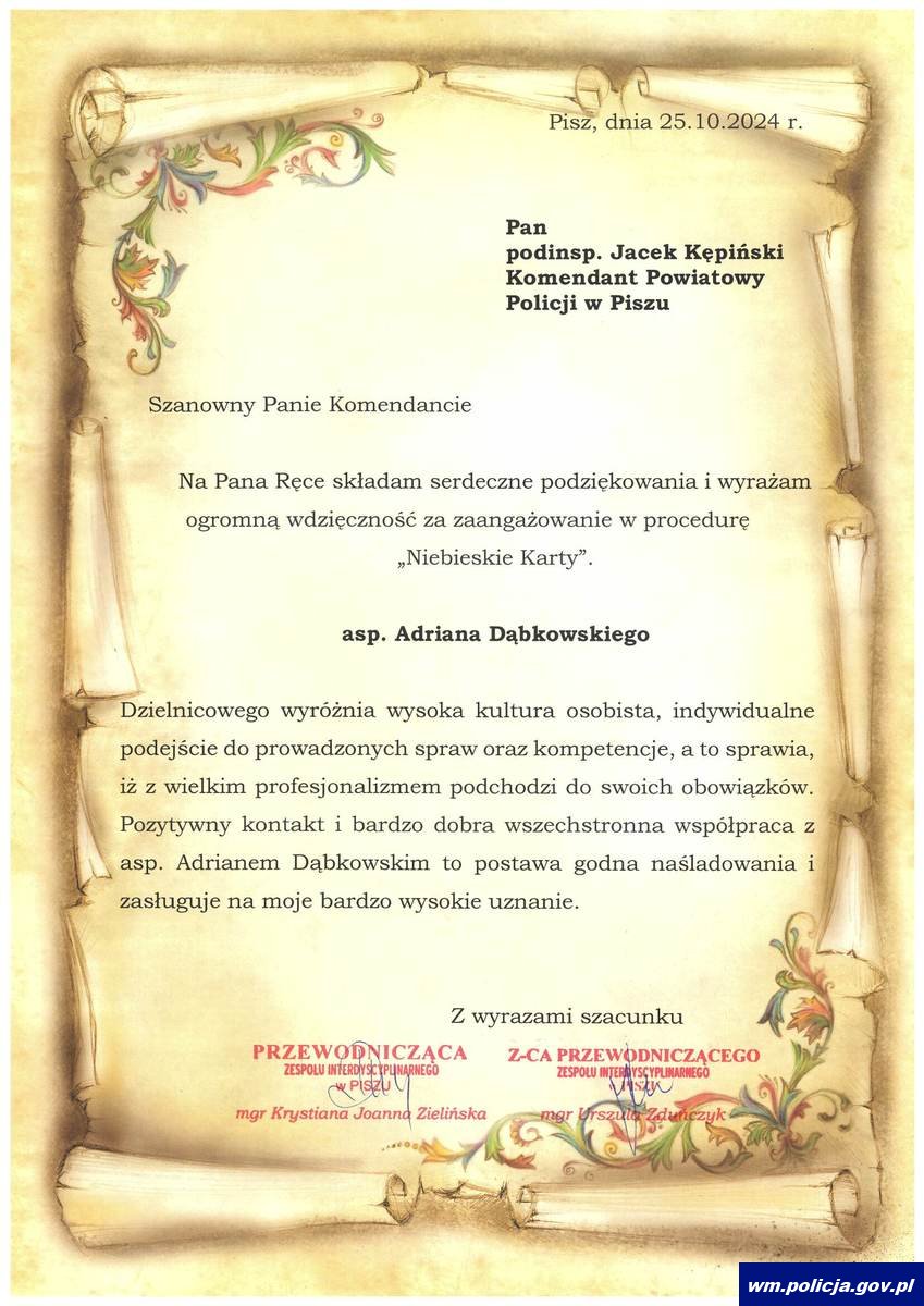 Podziękowanie dla dzielnicowego asp. Adriana Dąbkowskiego za zaangażowanie w realizację procedury ,,Niebieskie Karty” Powrót Drukuj 25.10.2024 r.