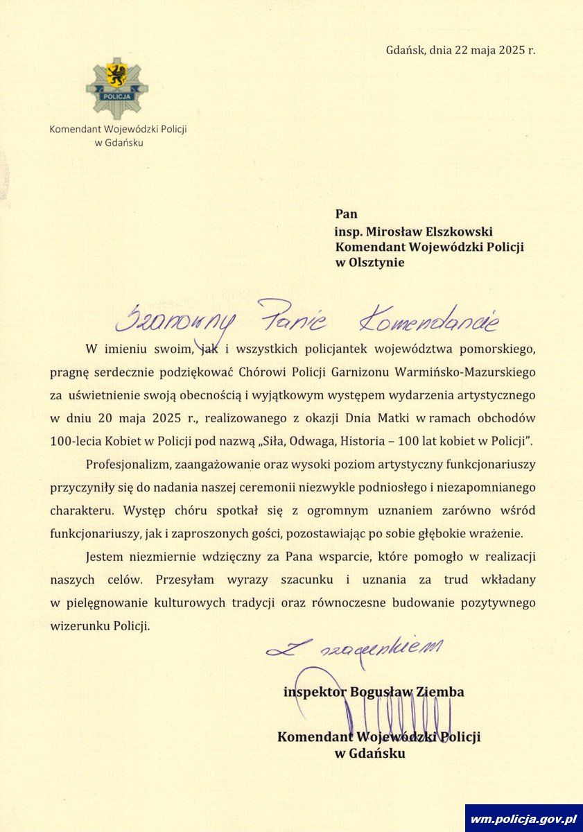 Podziękowanie za udział Chóru Policji Garnizonu Warmińsko - Mazurskiego w wydarzeniu artystycznym z okazji Dnia Matki Powrót Drukuj 22.05.2025 r.