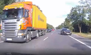 Na drodze S7 w podelbląskim Kazimierzowie jeden z kierowców zarejestrował na filmie niezwykle groźną sytuację drogową. 58-letnia kobieta wyprzedzając inne auto wyjechała swoim fordem na tzw. „czołówkę” i zmusiła innego kierowcę do ratowania się wjechaniem do rowu.