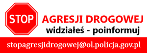 - Bezpieczeństwo to nasza wspólna sprawa! Stop agresji drogowej! Każdy z nas może przyczynić się do wzrostu bezpieczeństwa na naszych drogach oraz do tego, by piraci drogowi ponosili konsekwencje swojej bezmyślności. W dobie dynamicznie rozwijającej się technologii i wszechobecnego Internetu, czasami wystarczy do tego jeden mail wysłany policjantom. Skrzynki mailowe „STOP agresji drogowej” działają w każdej komendzie wojewódzkiej i to właśnie tam uczestnicy ruchu drogowego mogą przesyłać nagrania, na których uwiecznili rażące naruszenia przepisów ruchu drogowego przez inne osoby.