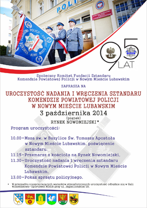 - Nowe Miasto Lub.: Uroczyste wręczenie sztandaru Komendzie Powiatowej Policji w Nowym Mieście Lubawskim 3 października 2014 roku był dniem szczególnym dla wszystkich nowomiejskich policjantów i pracowników komendy. Tego dnia został nadany i wręczony sztandar Komendzie Powiatowej Policji w Nowym Mieście Lubawskim. Uroczystość zaszczycili swoją obecnością szczególni goście m.in. generałowie Policji nadinsp. Wojciech Olbryś Zastępca Komendanta Głównego Policji, nadinsp. Józef Gdański Komendant Wojewódzki Policji w Olsztynie i nadinsp. Wojciech Sobczak Komendant Wojewódzki Policji w Gdańsku.