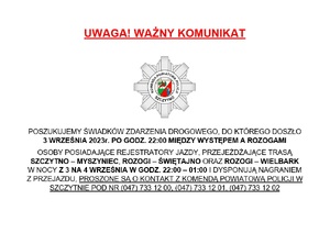 - Poszukujemy świadków zdarzenia drogowego Policjanci z Komendy Powiatowej Policji w Szczytnie poszukują świadków zdarzenia drogowego, do którego doszło 3 września br. na drodze krajowej nr 53. Między miejscowościami Występ - Rozogi, doszło do śmiertelnego potrącenia 58-letniego mężczyzny. Kierowca pojazdu oddalił się z miejsca zdarzenia.